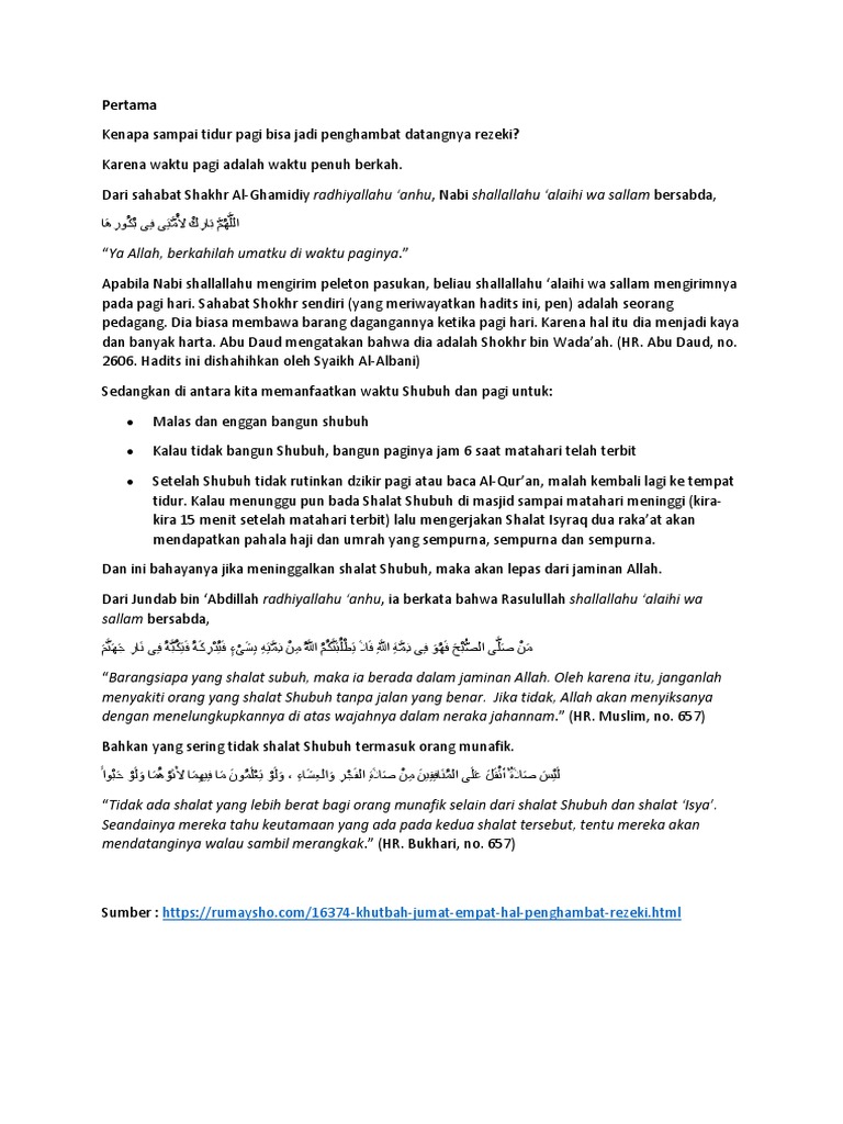 Keutamaan sholat subuh rumaysho. Namun sayang tidak sedikit dari yang mengaku muslim yang meninggalkan shalat shubuh seringnya telat bahkan tidak bangun shubuh dan lebih senang bermanja manja dengan kasurnya. Dalam shahih muslim telah disebutkan mengenai keutamaan shalat ini dalam beberapa hadits juga dijelaskan anjuran menjaganya begitu pula diterangkan mengenai ringkasnya nabi shallallahu alaihi wa sallam dalam melakukan shalat tersebut. Shalat subuh adalah faktor dilapangkannya rezeki.