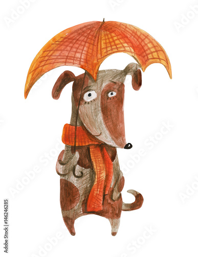 Dog With Red Plaid Umbrella Watercolor Illustration Hand