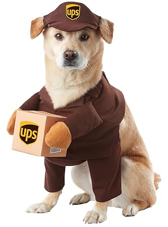 Your canine courier will deliver the goods when hes dressed in the california costumes ups delivery driver dog costume. Delivered to a house today and was greeted by this yellow boi with a note in his mouth. This unique high quality pet costume is officially licensed by ups so it features authentic company brand logos on the included shirt cap and box.