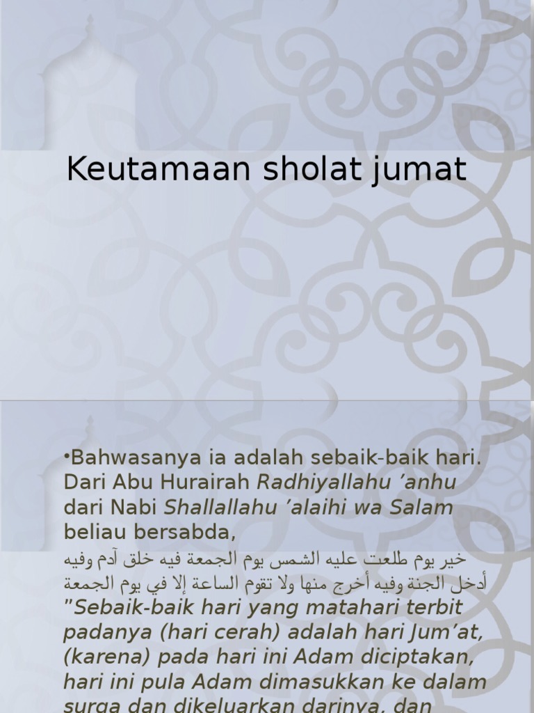 Keutamaan sholat jumat dan sejarah sholat jumat keutamaan hari jumat dalam islam adalah hari jumat merupakan penghulunya hari sayyidul ayyam. Sedekah di hari jumat hendaknya juga dilakukan sebelum berangkat pergi untuk menunaikan sholat jumat dan juga sangat dianjurkan untuk memberi sedekah tanpa diketahui oleh orang lain. Di antara keutamaan shalat tersebut bisa menghapuskan dosa dan kesalahan juga bisa meninggikan derajat seorang mukmin bi idznillah.