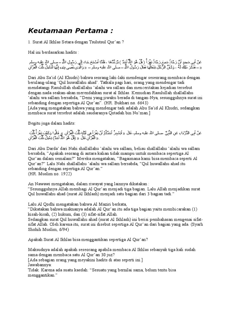 Hadits hadits yang menerangkan keutamaan surat al ikhlas. Di antaranya adalah tiga keutamaan berikut ini. Keutamaan surat al ikhlas.