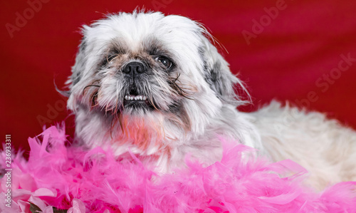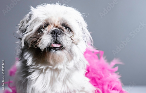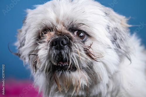 Funny Close Up Of Ugly Dog On Blue Background Shih Tzu