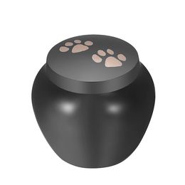 This affordable small urn comes in either light or dark brown with a touching inscription dogs leave paw prints on your heart forever.