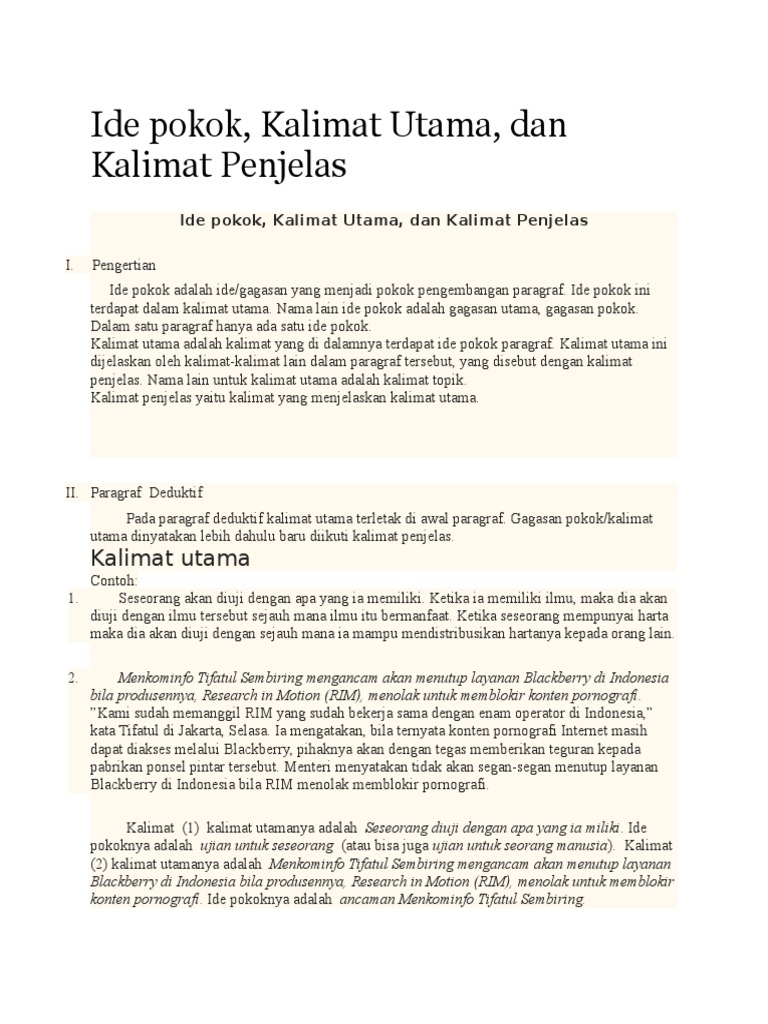 Baca bacaan dengan saksama dan pahami isinya. Kalimat utama adalah kalimat yang di dalamnya terdapat ide pokok paragraf. Letak kalimat utama dalam sebuah paragraf dapat berada di awal, tengah, atau pada sebagaian besar paragraf. Kunci utama dalam menentukan ide pokok suatu paragraf adalah membacanya secara cermat. Materi persiapan un bahasa indonesia quotmencari ide pokok kalimat utama dan kalimat penjelasquot. Bacalah sebuah wacana kemudian tutuplah wacana tersebut. Nah, kalimat utama ini berisi gagasan utama. Ide pokok ini terdapat dalam kalimat utama. Dalam satu paragraf hanya ada satu ide pokok. Kalimat utama juga sering disebut sebagai kalimat topik. Keberadaan kalimat utama pada suatu paragraf sangat penting karena menjadi kerangka dasar dalam pengembangan paragraf. Kalimat utama adalah kalimat yang di dalamnya terdapat ide pokok paragraf. Kalimat utama biasanya bersifat umum dan memuat keseluruhan isi dalam suatu paragraf.